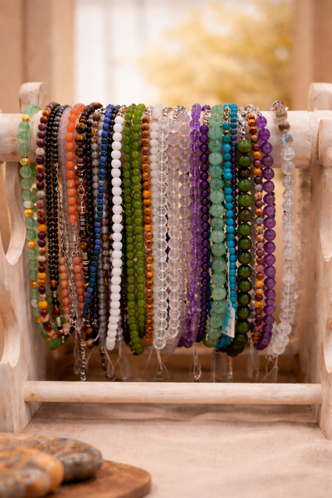 Je crée des bijoux en pierres naturelles sélectionnées pour leurs vertus énergétiques. Chaque pierre accompagne une intention : apaisement, protection, confiance, ancrage…